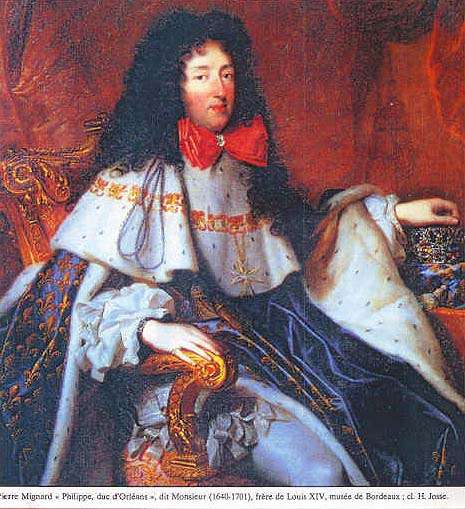 06.01.09 | SAINT-SIMON, dans ses Mémoires, dresse de lui un portrait resté célèbre : « C’était un petit homme ventru, monté sur des échasses tant ses souliers étaient hauts, toujours paré comme une femme, plein de bagues, de bracelets et de pierreries partout, avec une longue perruque toute étalée devant, noire et poudrée et des rubans partout où il pouvait mettre, plein de sortes de parfums et en toutes choses la propreté même. On l’accusait de mettre imperceptiblement du rouge... » [1]. Philippe d’Orléans dit Monsieur, frère cadet de Louis-Dieudonné dit Louis XIV, avait alors la cinquantaine.