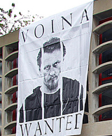 Membres du collectif Voïna (« guerre » en russe) créé en 2005, habitué des performances spectaculaires et provocatrices dans l’espace public à connotation politique (action « Fuck for the heir Puppy Bear ! » dans un musée, dessin d’un pénis géant sur un pont face au bâtiment des services secrets russes). Voïna a remporté à la mi-avril 2011 un prix d’art contemporain organisé par le ministère de la Culture russe. Oleg Vorotnikov et Leonid Nikolaïev ont été arrêtés, après une manifestation anti-corruption à Saint-Pétersbourg, pour avoir retourné une voiture de police. Pour Leonid, il s’agissait d’une performance : « Cette voiture renversée à l’entrée du Musée russe, c’était une installation artistique pour demander une réforme au ministère de l’Intérieur » (Les Inrocks). Poursuivis pour « action criminelle motivée par une haine politique, raciale, nationale ou religieuse ou par une hostilité envers un groupe social particulier » où ils risquaient sept ans de prison, après quatre mois de détention, ils ont été libérés sous caution (estimée à environ 20 000 dollars) payée par le street-artiste britannique Bansky. Nadejda Tolokonnikova, membre des Pussy Riot (voir au-dessus) fait également partie de Voïna.