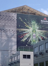 19.08.14 | DE LA SEINE, ON NE VOIT QU’ELLE. Quai de Conti, à deux pas de l’Institut de France, la pub pour la bière Heineken s’étale sur 600m2 de la façade XVIIIème de l’hôtel de la Monnaie de Paris, doublée d’une seconde, impasse de Conti. En place depuis le 15 juillet 2014, éclairée une partie de la nuit, elle doit rester accrochée jusque fin août et aura été visible pendant toute la durée de Paris Plages qui se tenait sur la rive opposée, pile face à l’espace d’animations du musée du Louvre accueillant de nombreux enfants.