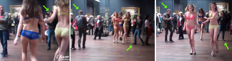 Ce n’est qu’en quittant ces salles en étage que les jeunes filles vont être repérées pour leur tenue inadéquate. On les voit passer en courant devant un gardien qui, dans la seconde, n’a pas le temps d’intervenir, ce qui est tout à fait compréhensible. Prévenue de la situation selon la procédure, l’équipe d’intervention et de sécurité qui se trouvait à un autre endroit du musée ne pourra pas faire grand chose car elles seront déjà loin. Il semblerait qu’avant de regagner la sortie, les mannequins aient remis leurs impers qu’elles auraient à nouveau quittés pour tourner la dernière séquence. C’est là qu’un conservateur du musée leur aurait demandé des explications et qu’elles se seraient justifiées en racontant qu’elles fêtaient un enterrement de vie de jeunes filles. Puis on les a laissé partir sans se douter du but réel de l’action.
