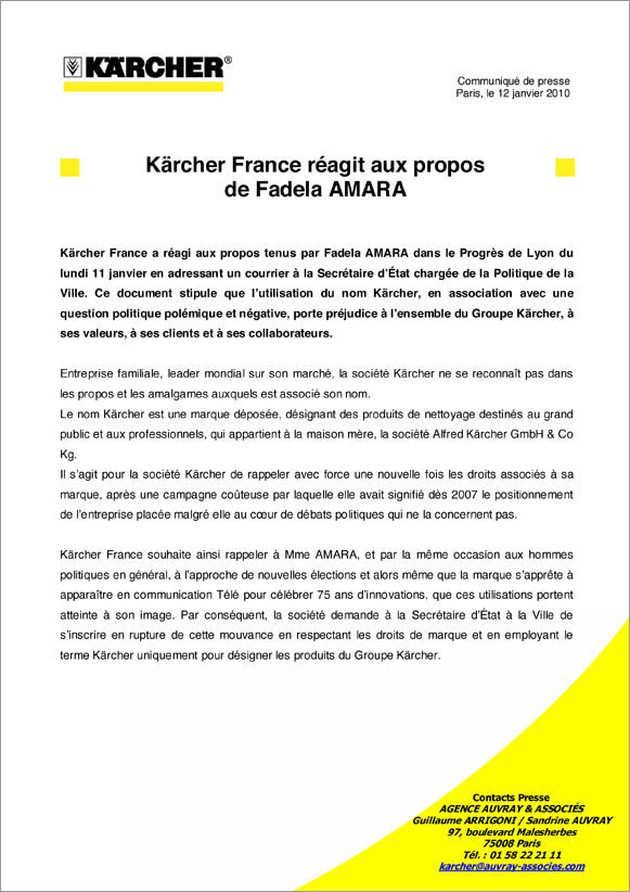 Merci qui ? Merci la secrétaire d’Etat à la politique de la ville Fadela Amara qui, le 11 janvier dernier, à l’instar d’un Nicolas Sarkozy ministre de l’Intérieur en 2005, avait cité la marque publiquement. « Oui, il faut nettoyer au Kärcher, nettoyer cette violence qui tue nos enfants dans les cités » avait-elle déclaré en réaction à la mort tragique, à Lyon, d’un enfant de douze ans lors d’une fusillade. Propos qui lui ont valu d’être qualifiée par Azouz Begag de « bon petit soldat du sarkozysme ».