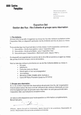 Devant l’affluence (prévisible) de l’expo Dali - une moyenne de 6700 visiteurs par jour, annonce le Centre -, les dispositions suivantes ont été prises depuis le 5 décembre : de 11h30 à 17h30, les publics, toutes visites confondues (musée, expos Dali et Lavier), doivent obligatoirement faire le tour du grand hall au rez-de-chaussée (le forum) avant d’accéder à la « chenille », les escalators extérieurs qui mènent aux étages. Ceci, afin « d’éviter pour le public une trop longue attente à l’extérieur » indique la note interne d’organisation. Ce qui, effectivement, a pu se produire certains jours, la file d’attente s’étirant, dehors, sur la piazza, dans le froid ou sous la pluie.