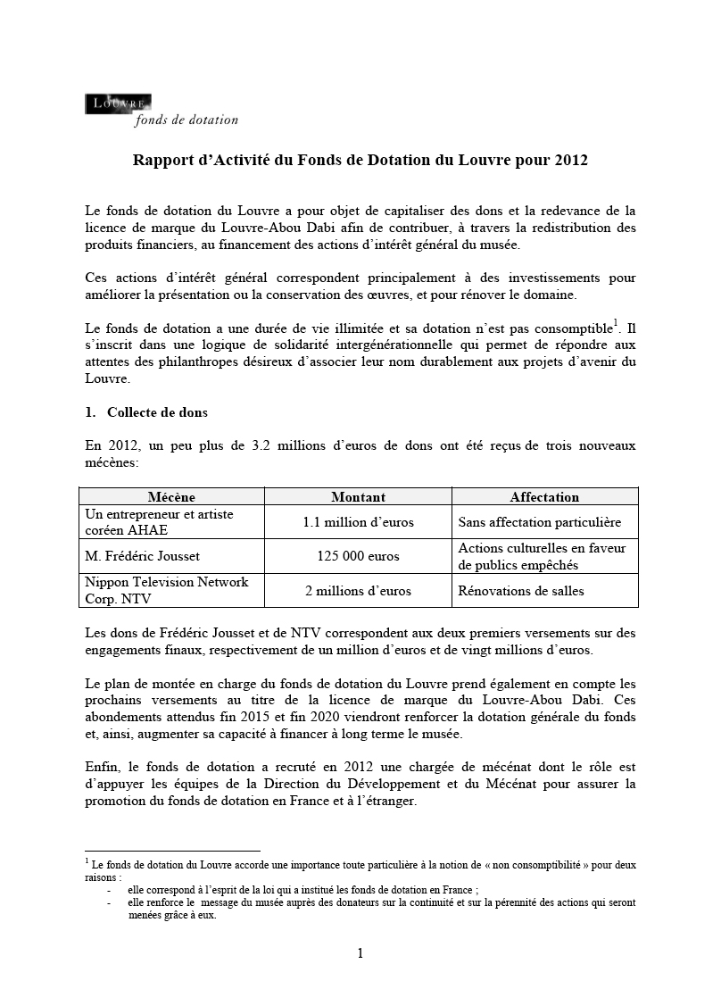 C’est sous la présidence au Louvre d’Henri Loyrette que l’exposition Ahae s’est tenue durant l’été 2012, dans le Jardin des Tuileries dépendant du musée. Henri Loyrette ne s’est pas contenté d’accueillir cette fastueuse privatisation, il a chanté les louanges du photographe, préfaçant un livre à sa gloire publié aux éditions Assouline. L’expression « L’extraordinaire dans l’ordinaire » pour qualifier l’oeuvre d’Ahae, c’est de lui. La même année, comme on peut le voir sur le document officiel ci-joint ou en ligne ici, il accepta plus discrètement un don de 1,1 million d’euros de la part de « l’entrepreneur et artiste coréen AHAE » versé au fond de dotation du musée du Louvre créé pour recevoir l’argent des Émirats arabes unis pour le projet du Louvre Abu Dhabi. L’information n’a jamais été mentionnée dans la presse française. Curieux croisement quand le même Henri Loyrette, prêt à quitter ses fonctions au Louvre, disait qu’« on peut être inventif (...) sans vendre son âme » et qu’un mécène n’intervient jamais dans les choix artistiques du musée : « On définit un projet puis on le propose à un mécène, qui l’accepte ou pas. C’est toujours dans ce sens que ça fonctionne. », déclarait-il au Monde (21 mars 2013). Sans qu’on sache pour quoi, le don Ahae ne concernait lui aucun projet. « Sans affectation particulière » précise le document. C’est au titre de mécène qu’Ahae a eu le privilège d’avoir son nom gravé à l’intérieur même du Louvre. A peu près au même moment, du 5 juin au 30 septembre 2012, s’est tenue en Corée du Sud, au Seoul Arts Center, l’exposition « Myths and Legends : Exhibition of Louvre Museum » pour laquelle Henri Loyrette a fait le déplacement.