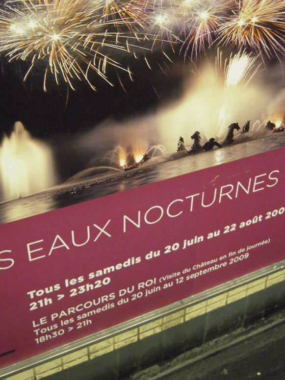 18.08.09 | TOUT L’ÉTÉ jusqu’à la mi-septembre, certains samedis, le Château de Versailles propose des visites « nocturnes » des Appartements royaux, de la Grande Galerie et de la Galerie des Batailles de 18h30 à 21h. Cette formule appelée « Parcours du Roi » est en fait une simple « visite du Château en fin de journée » comme l’indiquent, entre parenthèses, ses affiches dans le métro.