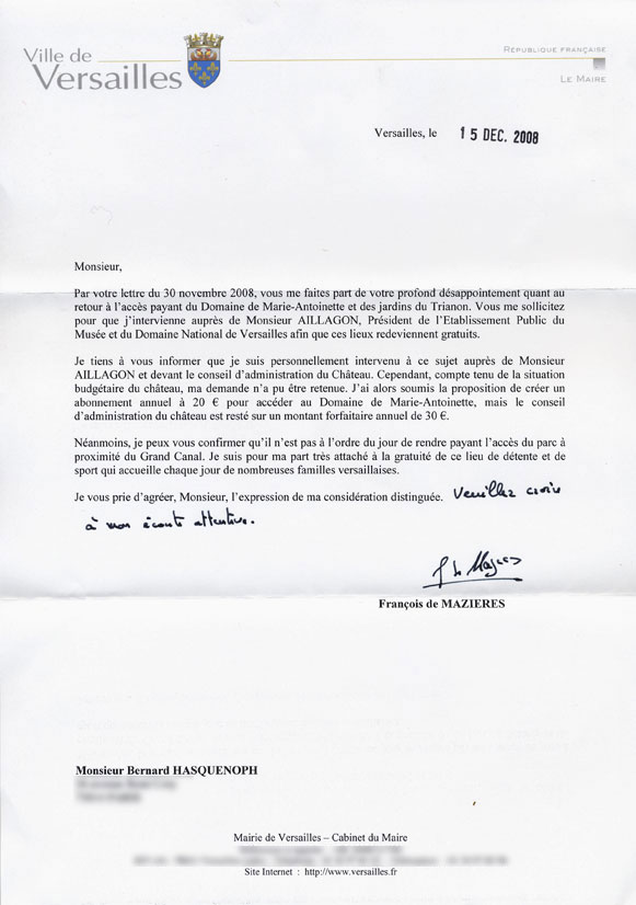 C’est ce que vient nous confirmer François de Mazières, maire de Versailles, dans la lettre qu’il nous a adressé aimablement le 15 décembre [1]. Le sachant partisan de la gratuité d’accès à ces jardins, nous avions sollicité son intervention auprès de la direction du château pour qu’elle revienne sur sa décision [2]. En vain, ce qui ne nous surprend pas compte-tenu de l’état d’esprit de ses dirigeants [3]. Nous tenons néanmoins à remercier Monsieur de Mazières pour ses efforts et pour son « écoute attentive ».