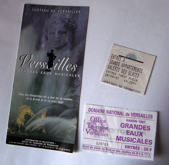 22 avril 2010 | VOILÀ L’ÉLÉMENT qui nous manquait dans le constat que nous faisions dans notre précédent article sur « la dangereuse multiplication des Grandes Eaux de Versailles » au regard des risques de dégradations irréversibles sur les éléments sculpturaux des bassins dues aux jets d’eau. Nous nous questionnons alors sur le moment où la courbe folle s’était élancée. Louis XIV a du nous entendre puisque, le lendemain de la mise en ligne de notre article, on découvrit par hasard chez un bouquiniste, entre les pages d’un guide sur Versailles, un dépliant de ces festivités datant de 1997 accompagné de quelques billets d’entrée.