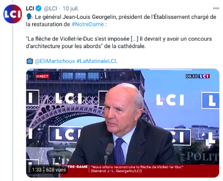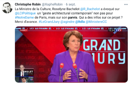 [107] « Il y a bien sûr la nécessité d’un geste architectural moderne. Et nous allons le faire sur les alentours, sur le parvis de Notre-Dame. A ce moment-là, le concours d’architectes pourra être utilement ouvert pour un geste architectural novateur. » in « Le Grand Jury de Roselyne Bachelot », RTL, 06.09.2020.