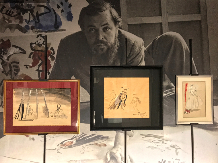 Vous pensez ne pas le connaître ? Pourtant, bien de ses créations sont entrées dans l’imaginaire collectif. Le masque fantastique de Jean Marais dans le film La Belle et la Bête de Jean Cocteau, c’est lui. Le dessin du Tailleur Bar qui immortalisa le premier défilé de Christian Dior, c’est lui. L’esquisse d’un costume pour la pièce de théâtre La Folle de Chaillot de Jean Giraudoux, reproduite sur la couverture d’un vieux livre de poche, c’est encore lui… Bérard, c’est un style qui aura influencé une myriade de créatifs et un look qui le rend identifiable immédiatement sur les milliers de photos où il se glisse, surtout une fois qu’il aura adopté cette barbe de hipster qui n’était pas encore tendance comme aujourd’hui. La scénographie de Frédéric Beauclair pour l’exposition d’Evian en abuse avec justesse, ses portraits agrandis à la taille des murs servant de cimaise aux textes et aux oeuvres.