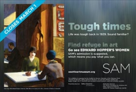 La méthode peut pourtant s’avérer très attractive. Fin 2008, alors que nombre de musées aux États-Unis augmentaient substantiellement leur prix d’entrée pour faire face à la crise, n’étant pas comme chez nous soutenus par l’Etat, le Seattle Art Museum (SAM), dans l’État de Washington, proposait une exposition consacrée aux femmes dans l’oeuvre du peintre Edward Hopper avec cet argument publicitaire fort : « You pay what you can » (Vous payez ce que vous pouvez). L’affiche, dressant un parallèle entre les temps difficiles d’aujourd’hui et la crise de 1929, recommandait de se réfugier dans l’art en venant voir l’exposition, précisant que « le prix d’entrée au SAM est suggéré, ce qui signifie que vous payez ce que vous pouvez ».